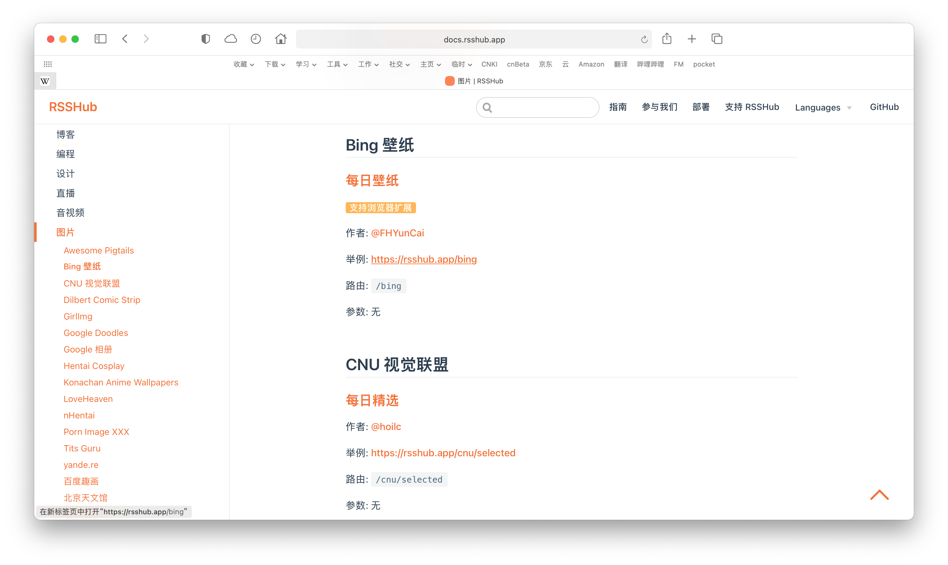 例如,我想要订阅微软旗下的搜索引擎Bing.com的每日壁纸,在RSSHub网站的图片分类中找到Bing 壁纸,复制它示例的源链接.