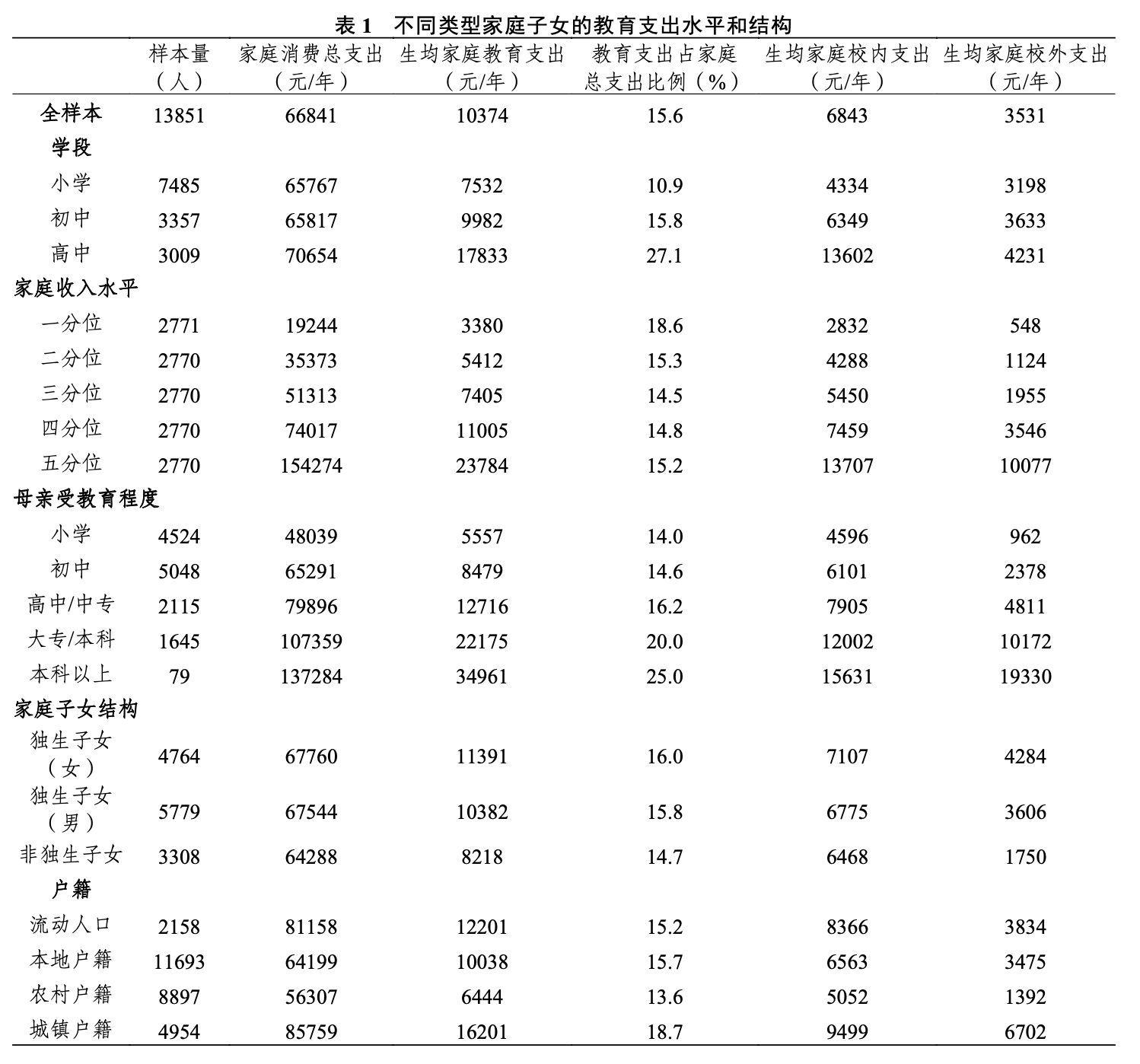 表1 对该报告进行了相对全面的总结,从中可以看出,家庭中母亲受教育程度为大专及本科的家庭,年度总支出中有五分之一都是教育相关的支出,教育支出中用于校内教育的占比为54.1%,用于校外教育的占比为45.9%.而家庭中母亲受教育程度为本科以上的家庭,年度总支出中有四分之一都是教育相关的支出,在教育支出中,教育支出中用于校内教育的占比为44.7%,用于校外教育的占比为55.3%.
